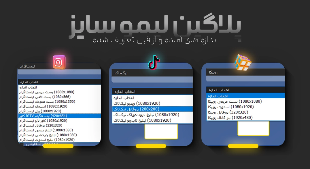 - این افزونه شامل یه لیست کامل از اندازههای استاندارد برای بیش از 30 پلتفرم شبکههای اجتماعی و رسانهای مثل اینستاگرام، توییتر (ایکس)، یوتیوب، تیکتاک، تلگرام و حتی پلتفرمهای ایرانی روبیکا، ایتا، آپارات و سروش پلاس میشه.